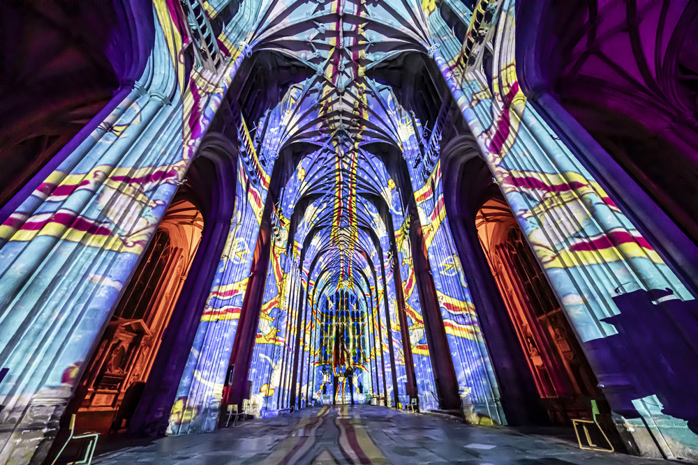 ‘We are delighted to return to Exeter Cathedral – a most remarkable setting for journeying visitors through our unique light and sound installations,’ says Peter Walker, Artistic Director of Luxmuralis.
