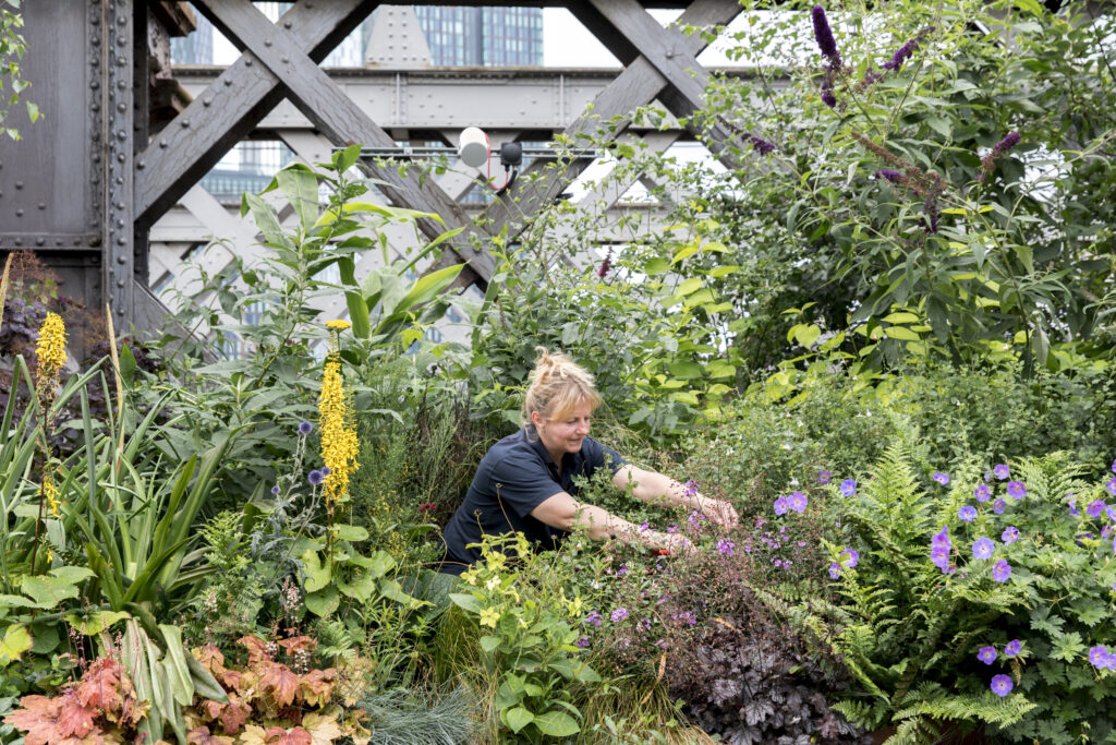 A gardener at work at Castlefield Viaduct, Manchester. Photographer: Annapurna Mellor (image provided by The National Trust).