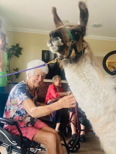 ‘Our specially selected and trained therapy llamas are really well suited to care home visits as they are incredibly calm and gentle and love interacting with people,’ explains Maggie.
